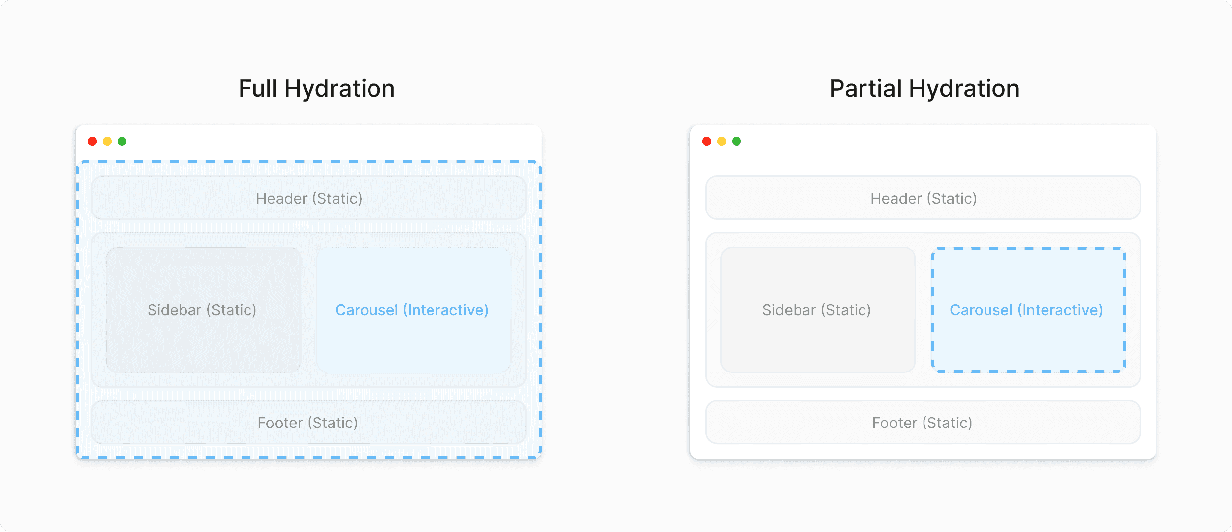 Full hydrationBoot the whole tree; attach handlers everywhereSimple mental model; can be JS-heavy on content pages